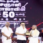 “சிம்பொனி – சிகரம் தொட்ட தமிழன் இசைஞானி இளையராஜா – பொன்விழா ஆண்டு 50” என்ற தலைப்பில் சென்னை நேரு உள்விளையாட்டு அரங்கில் தமிழக அரசு சார்பில் இந்த பாராட்டு விழா நடைபெற்று வருகிறது.