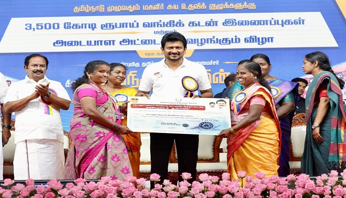 தமிழ்நாடு துணை முதலமைச்சர் உதயநிதி ஸ்டாலின் இன்று (16.9.2025) சேலம், கருப்பூர் அரசு பொறியியல் கல்லூரி வளாகத்தில் நடைபெற்ற நிகழ்ச்சியில், தமிழ்நாடு மகளிர் மேம்பாட்டு நிறுவனத்தின் சார்பில் தமிழ்நாடு முழுவதும் சுய உதவிக் குழுக்களின் உறுப்பினர்களுக்கு 3,500 கோடி ரூபாய் வங்கிக் கடன் இணைப்புகள் மற்றும் உறுப்பினர்களுக்கு அடையாள அட்டைகளை வழங்கப்படுவதன் ஒருபகுதியாக 100 மகளிர் சுய உதவிக் குழுக்களின் உறுப்பினர்களுக்கு வங்கிக் கடன் இணைப்புகள் மற்றும் அடையாள அட்டைகளை வழங்கினார். இந்நிகழ்ச்சியையொட்டி அமைக்கப்பட்ட மகளிர் சுய உதவிக் குழுவினரின் தயாரிப்பு பொருட்களின் கண்காட்சியையும் அவர் பார்வையிட்டார்.